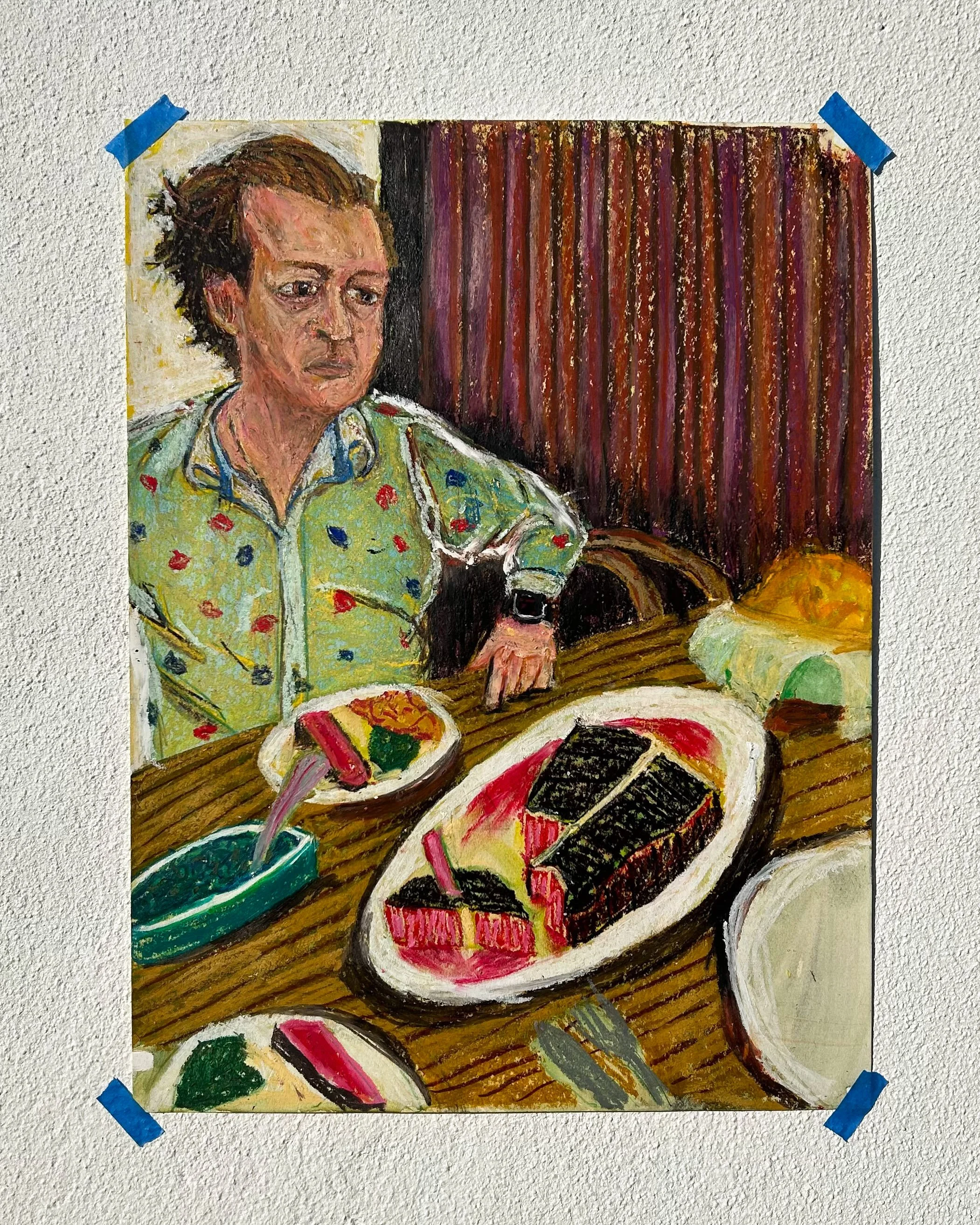Hotdog Johnnys Booth, 2023, Gouache, Chalk Pastel and Oil Pastel on paper - 24" x 18"