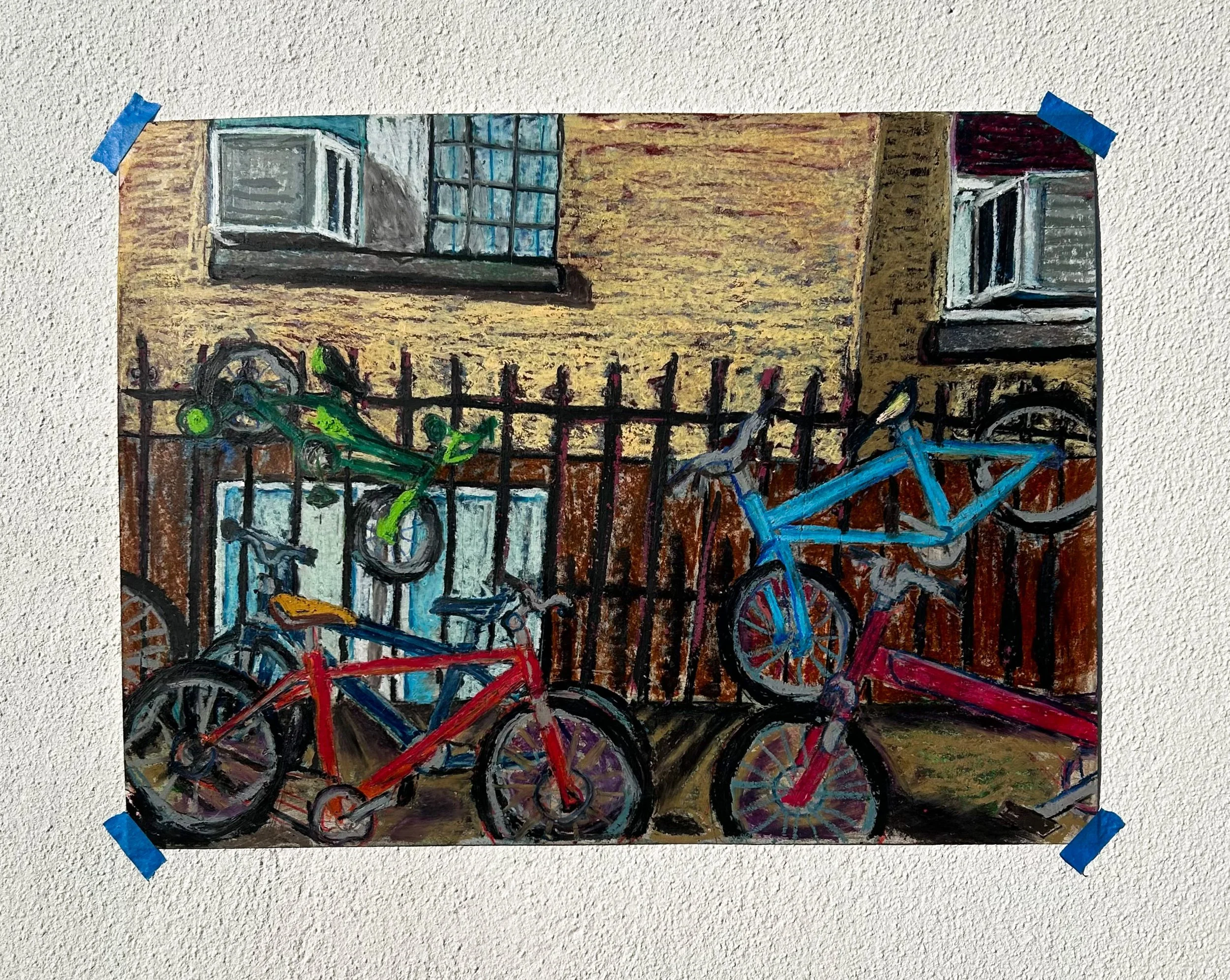 Hanging Bikes, 2023, Gouache, Chalk Pastel and Oil Pastel on paper - 24" x 18"