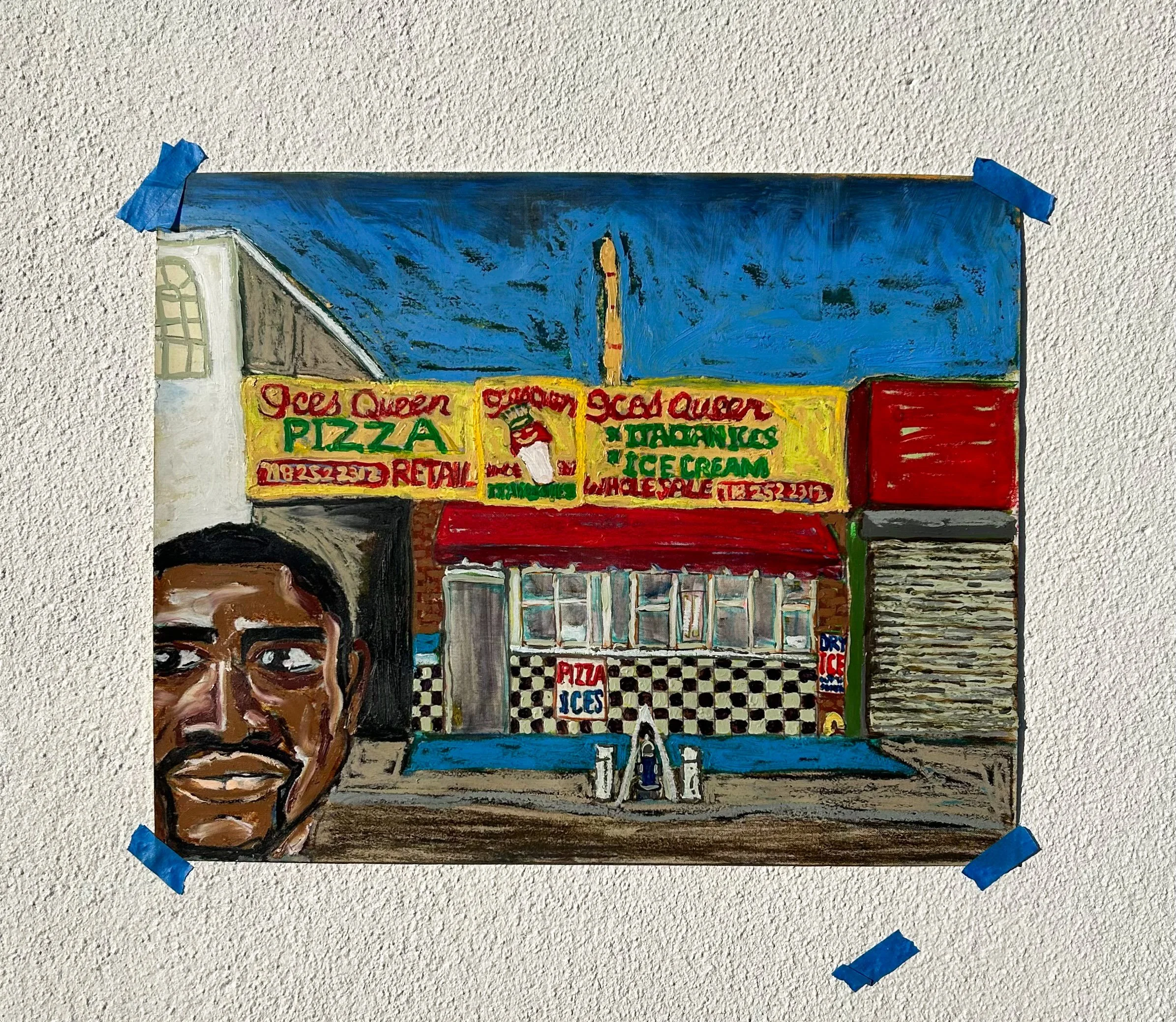 Ices Queen East Flatbush, 2024, Watercolor, Acrylic Chalk Pastel and Oil Pastel on paper - 20" x 16"