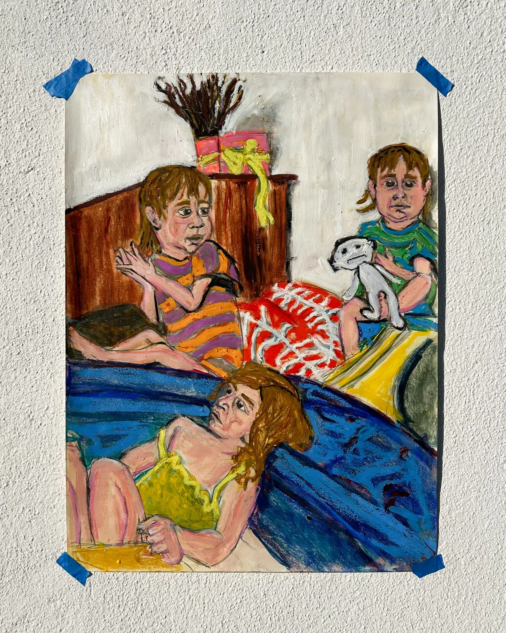 Three Kids on Couch, 2024, Gouache, Chalk Pastel, Oil Pastel and Oil Stick on Paper - 24" x 18"