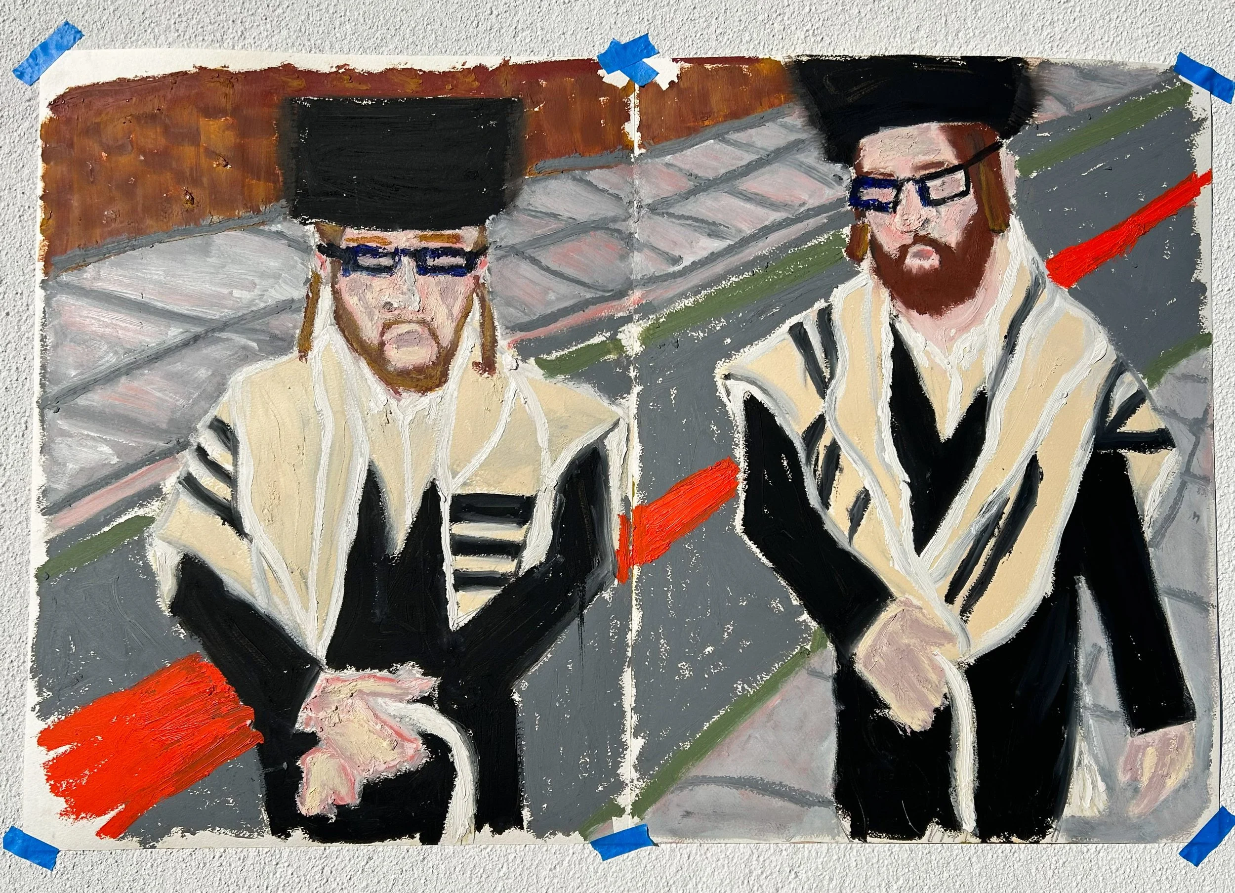 Hasids in Williamsburg, 2022, Oil Stick on paper - 36" x 24"
