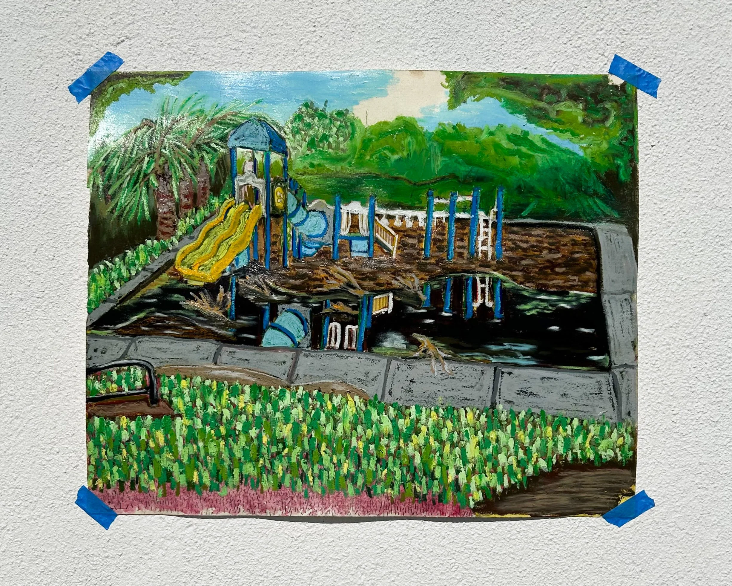 Flooded Playground After Hurricane, 2024, Gouache, Chalk Pastel, Oil Pastel on paper - 20" x 16"