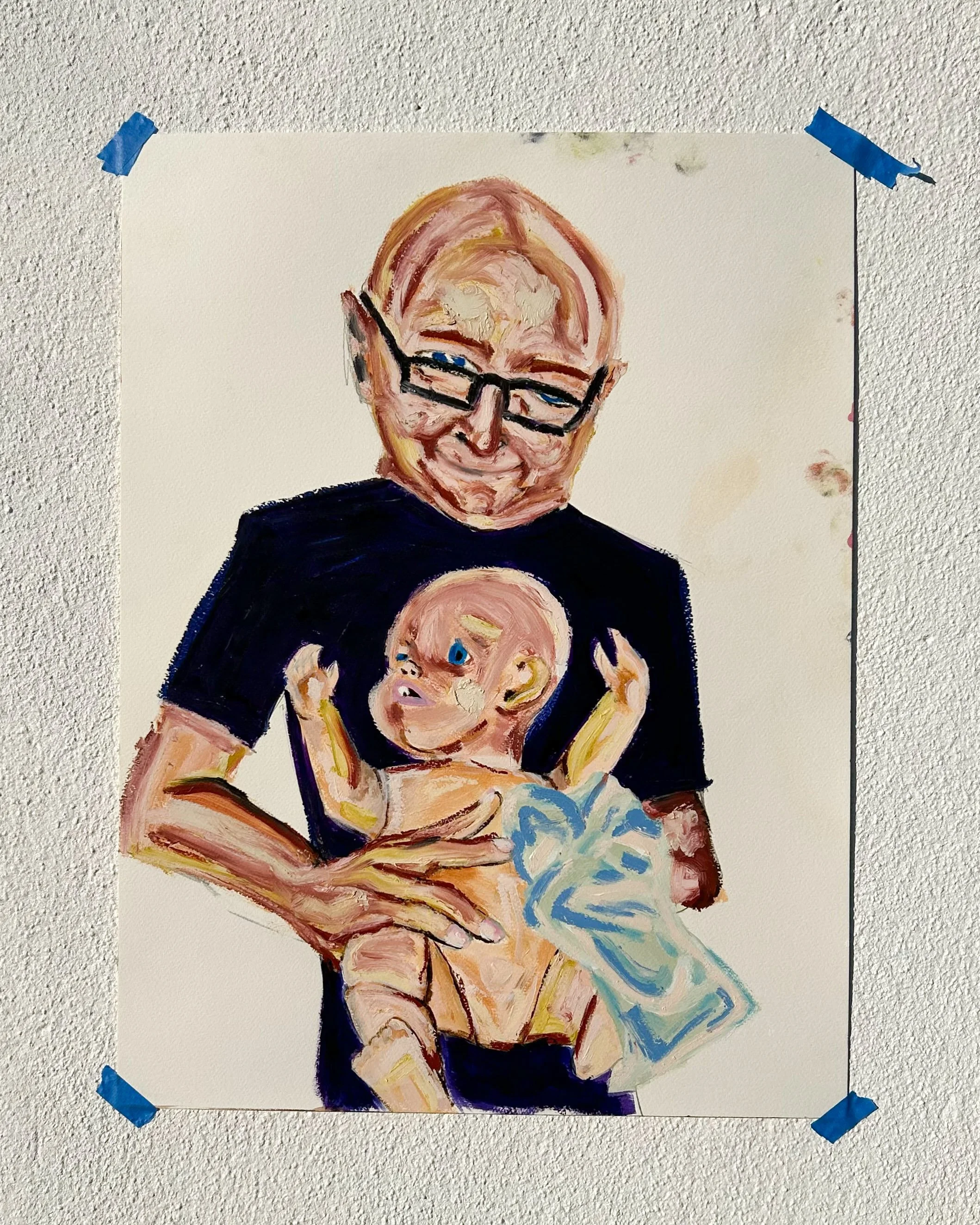 Raymond Cleaning a Baby Doll, 2022, Acrylic and Oil Stick on paper - 24" x 18"