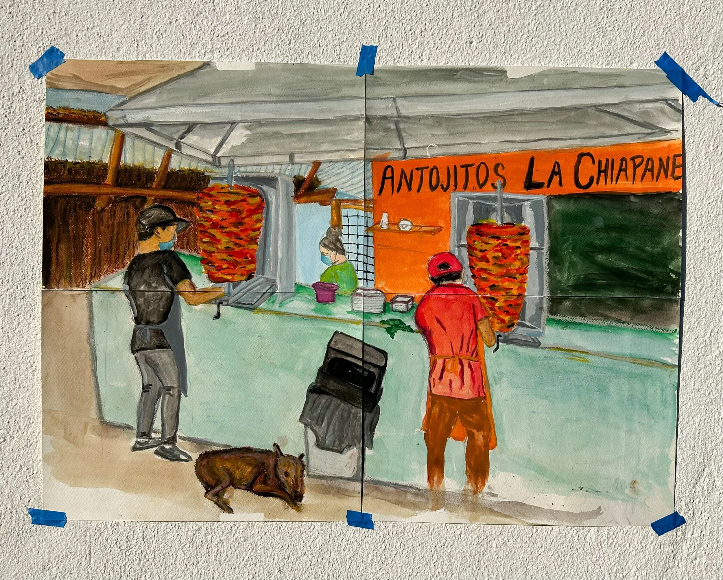 Tulum Tacos, 2022, Watercolor and Oil Pastel on paper - 28.5" x 20.5"